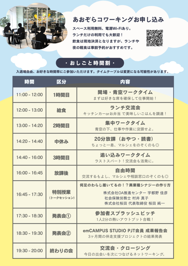 ※雨天決行(コワーキングはピロティ中心)、荒天中止