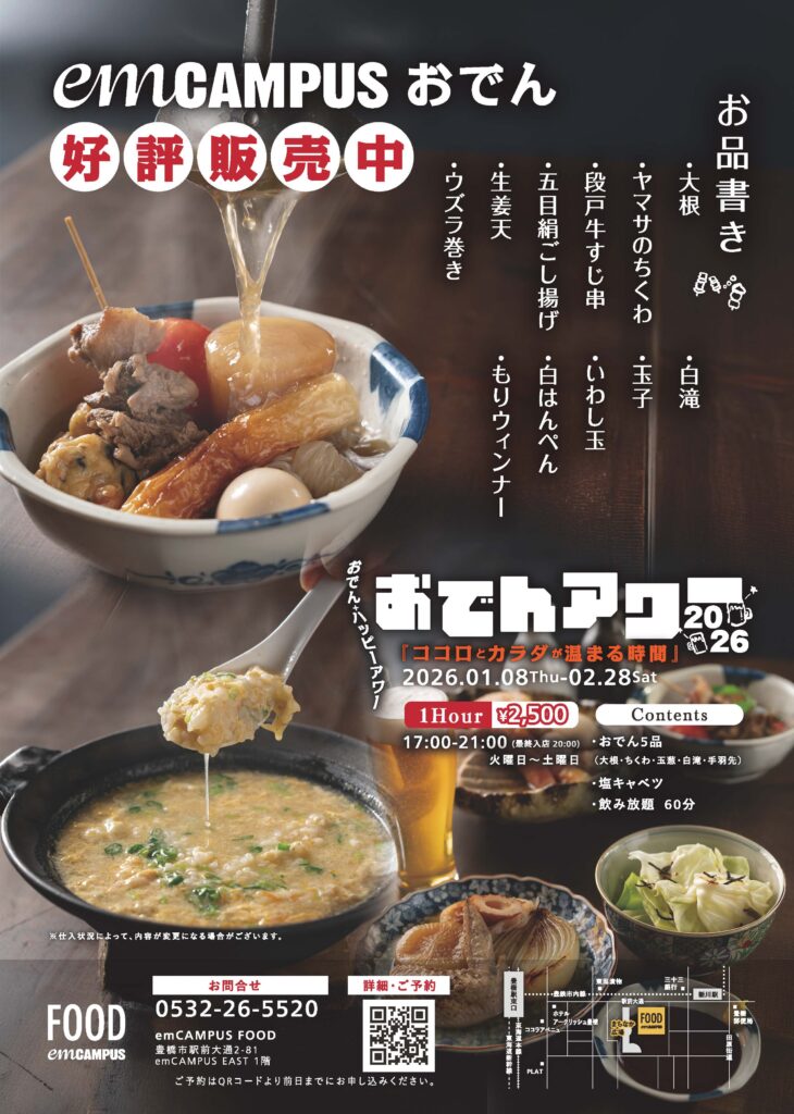 emCAMPUS FOODトピックス 2026/01/15 #フードホール おでんアワー シェア Tweet ココロとカラダが温まる時間 おでん+ハッピーアワー=『おでんアワー』おでんの盛り合わせと飲み放題60分がセットになった「ちょい飲み」や「0次会」におススメのプラン。飲み放題の延長や、追加メニューもお楽しみいただけます。◆概要期 間 2026年1月8日(木)~2月28日(土)時 間 17:00~21:00(最終入店 20:00)料 金 2,500円(おでん5品・塩キャベツ・飲み放題60分)メニュー・ご予約はこちらより 一覧へ